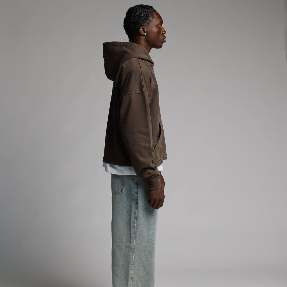 Meticulously crafted from 450 GSM 100% French Terry cotton, this zip hoodie delivers an exceptional balance of comfort, structure, and durability. Featuring a relaxed straight hem and slightly cropped silhouette, it redefines casual layering with a refined, street-ready edge.