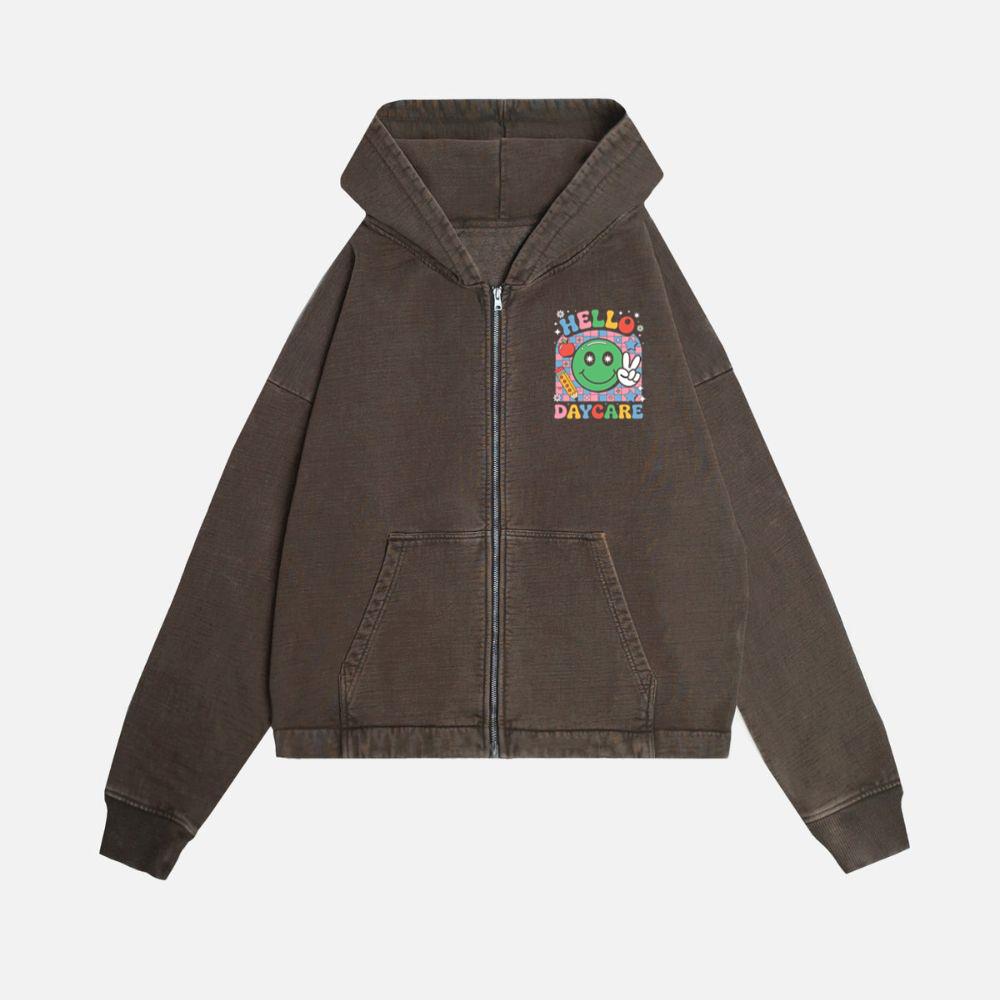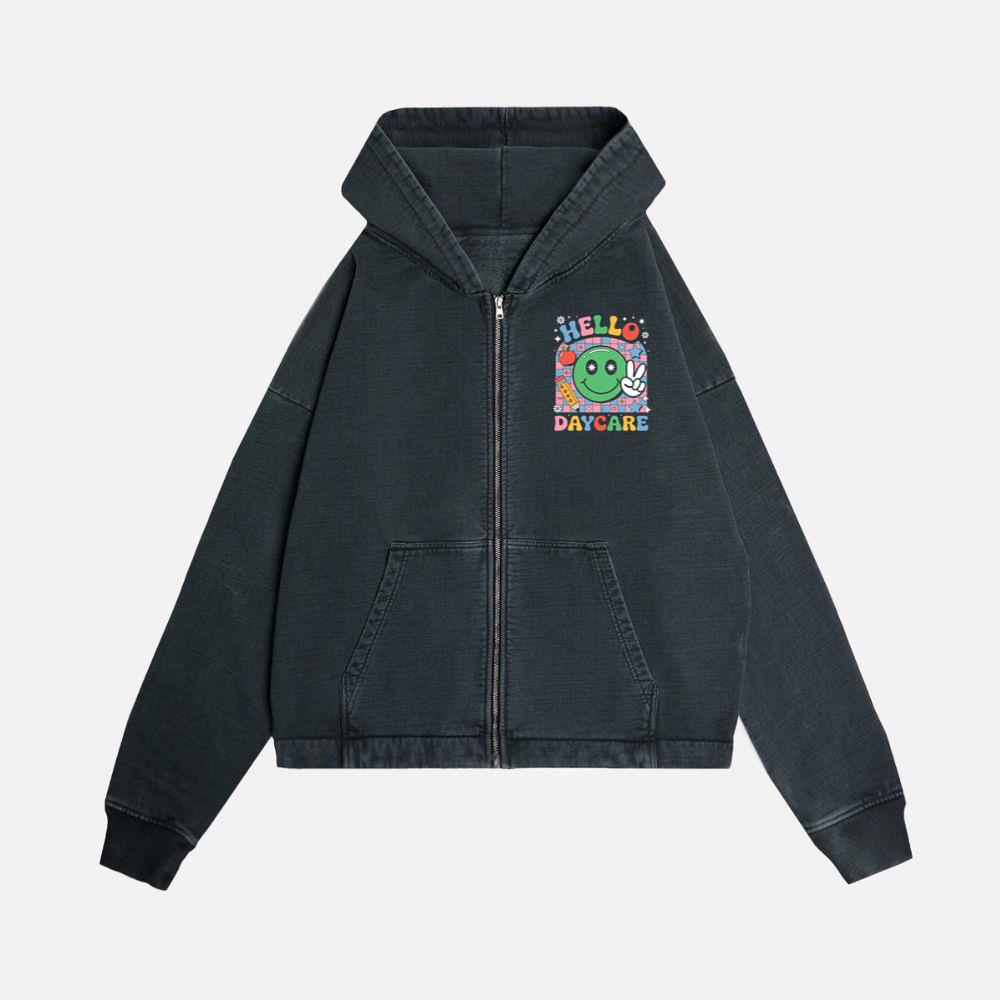 Hello Daycare Retro Smiley Face Graphic for Colorful Casual Wear Zip Hoodie